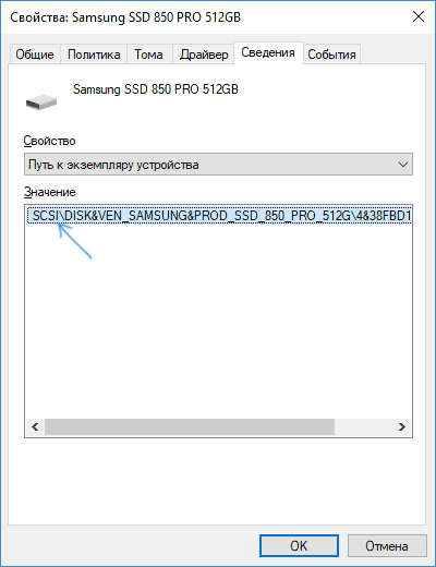 Также можно открыть свойства диска в диспетчере устройств и на вкладке Сведения посмотреть путь к экземпляру оборудования.