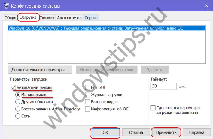 в открывшемся окошке написать: «bcdedit /set {current} safeboot minimal»;