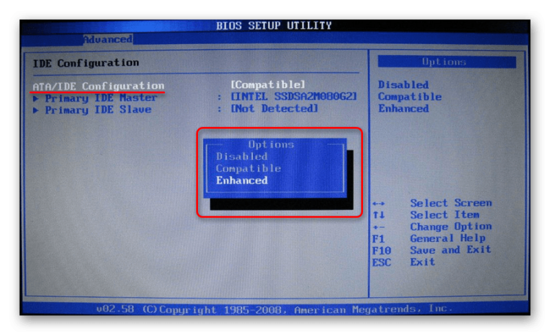 - IDE — режим совместимости с устаревшими жестким диском и Windows. Переключившись в этот режим, вы получите все особенности IDE-контроллера материнской платы. В целом это влияет на быстродействие работы HDD, понижая его скорость. Пользователю не нужно устанавливать дополнительные драйверы, поскольку они уже встроены в операционную систему.