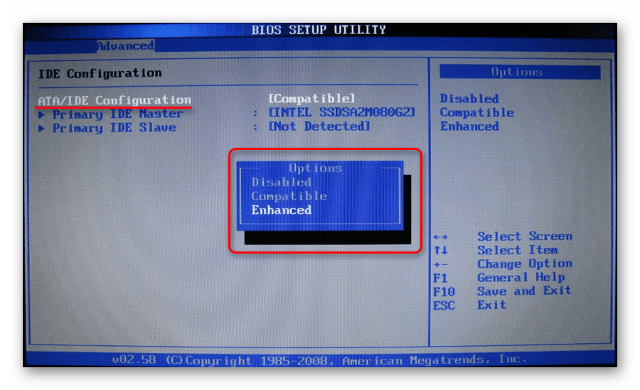 - IDE — режим совместимости с устаревшими жестким диском и Windows. Переключившись в этот режим, вы получите все особенности IDE-контроллера материнской платы. В целом это влияет на быстродействие работы HDD, понижая его скорость. Пользователю не нужно устанавливать дополнительные драйверы, поскольку они уже встроены в операционную систему.