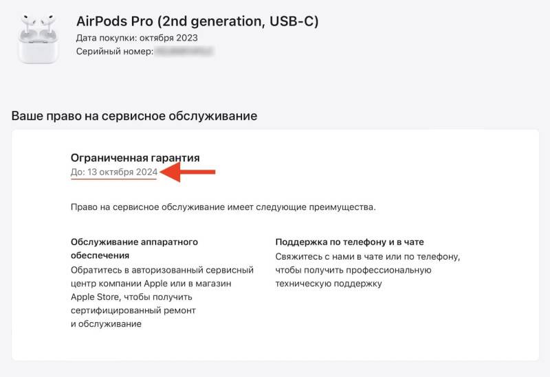 Ниже размещен скриншот с проверкой новых поддельных наушников AirPods Pro 2-ого поколения, купленных в январе 2024 года. Как видно, датой покупки наушников значится октябрь 2023 года. Исходя из данных о сроке гарантии можно сделать вывод, что оригинальные AirPods Pro 2-ого поколения с этим же серийным номером были активированы 14 октября 2023 года (365 дней до даты прекращения действия гарантии).