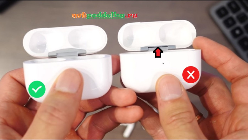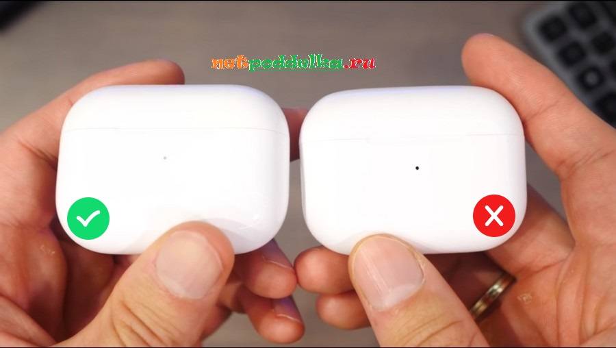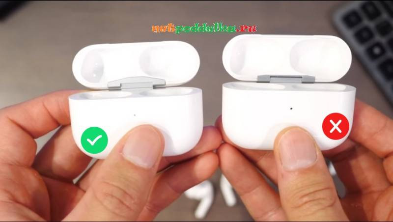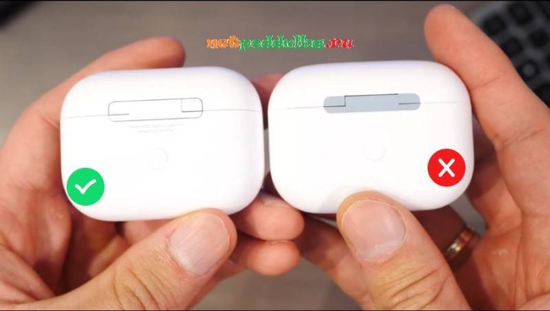 Еще один способ как проверить Аирподс Про на оригинальность ‒ осмотреть кейс. Необходимо поводить пальцем по месту, где расположен диод. У оригинала поверхность там идеально ровная. У реплики пальцем ощущается отверстие для светодиода.