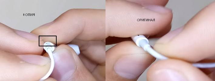 В месте, где провод с заглушкой соединяется с самим наушником, бывают щели и различные зазоры. У оригинальной продукции таких дефектов нет.