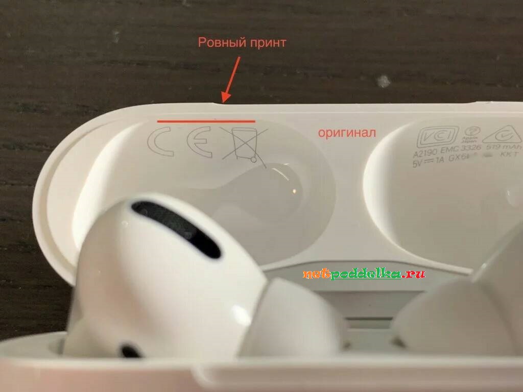 При осмотре зарядного кейса необходимо уделить внимание всем принтам. У настоящей гарнитуры все изображения и надписи четкие. У фальшивок они размазаны либо отсутствуют