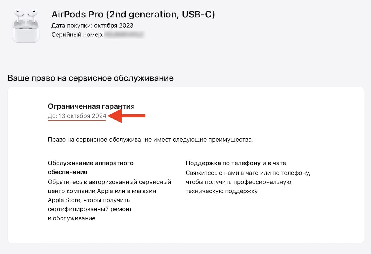 - На следующей странице вы должны будете увидеть пункты с зелёными галочками. Они заверяют нас, что мы имеем право на поддержку. Это и будет подтверждением того, что данная модель по введённому серийному номеру AirPods является оригинальной.