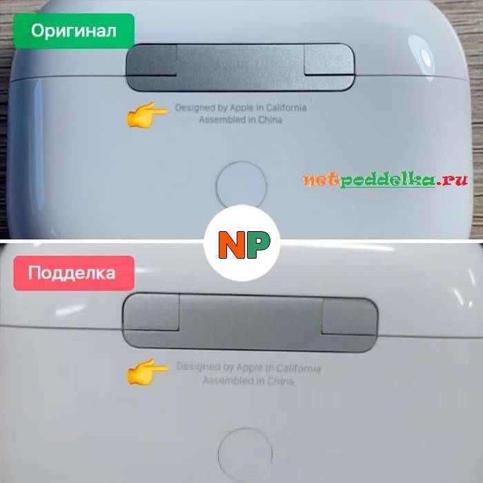 Ниже металлической петли должна присутствовать надпись «Designed by Apple in California. Assembled in China». У контрафакта она часто отсутствует, либо выполнена едва заметным шрифтом. Это еще один критерий как отличить наушники AirPods Pro от пали.