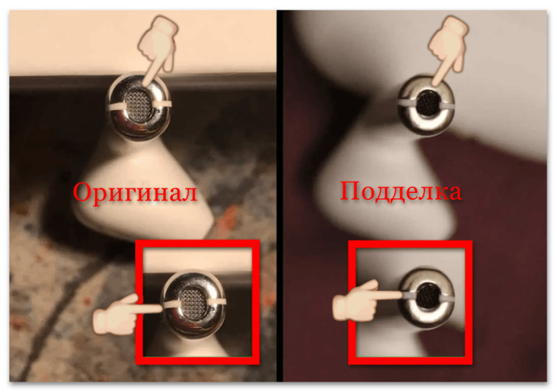В нижней пластмассовой части наушников есть отверстие. У оригиналов оно чёрного цвета, а у реплик серого.