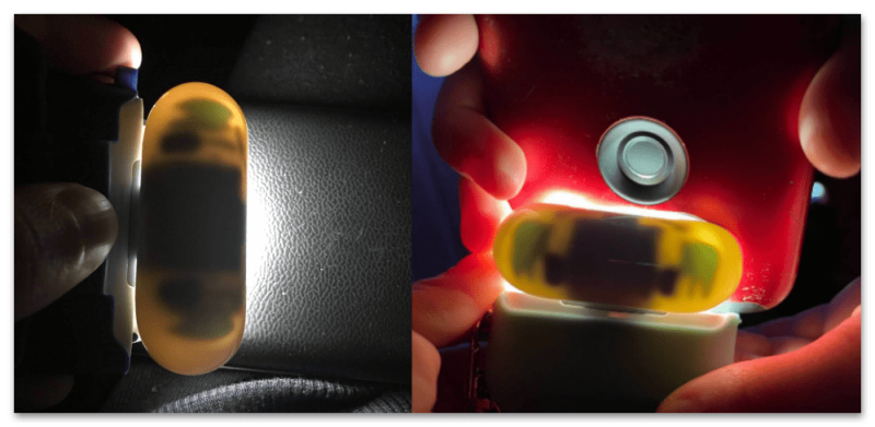 Ещё один приём, который можно задействовать, рассказали читатели в нашем чате в Telegram. Приложите телефон с включенным фонариком вплотную к крышке зарядного кейса, предварительно открыв её. Оригинальная крышка на просвет будет выглядеть так: