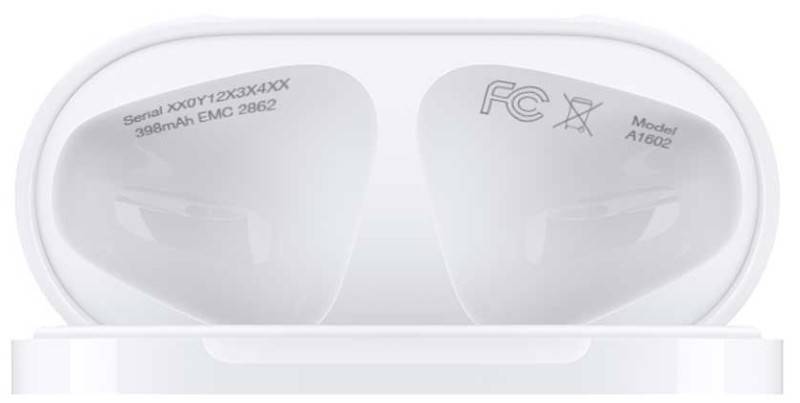 - в AirPods первого поколения Apple серийный номер одинаковый у обоих гарнитур и у зарядного кейса;