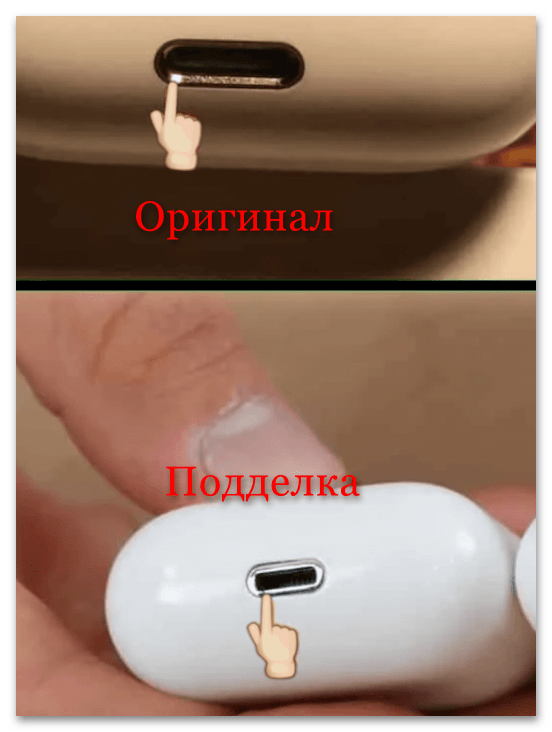 1. На заднюю часть зарядного кейса. Там находится кнопка, которая нужна для подключения наушников к iPhone. У оригинала она плоская, а у китайской подделки — выпуклая.
