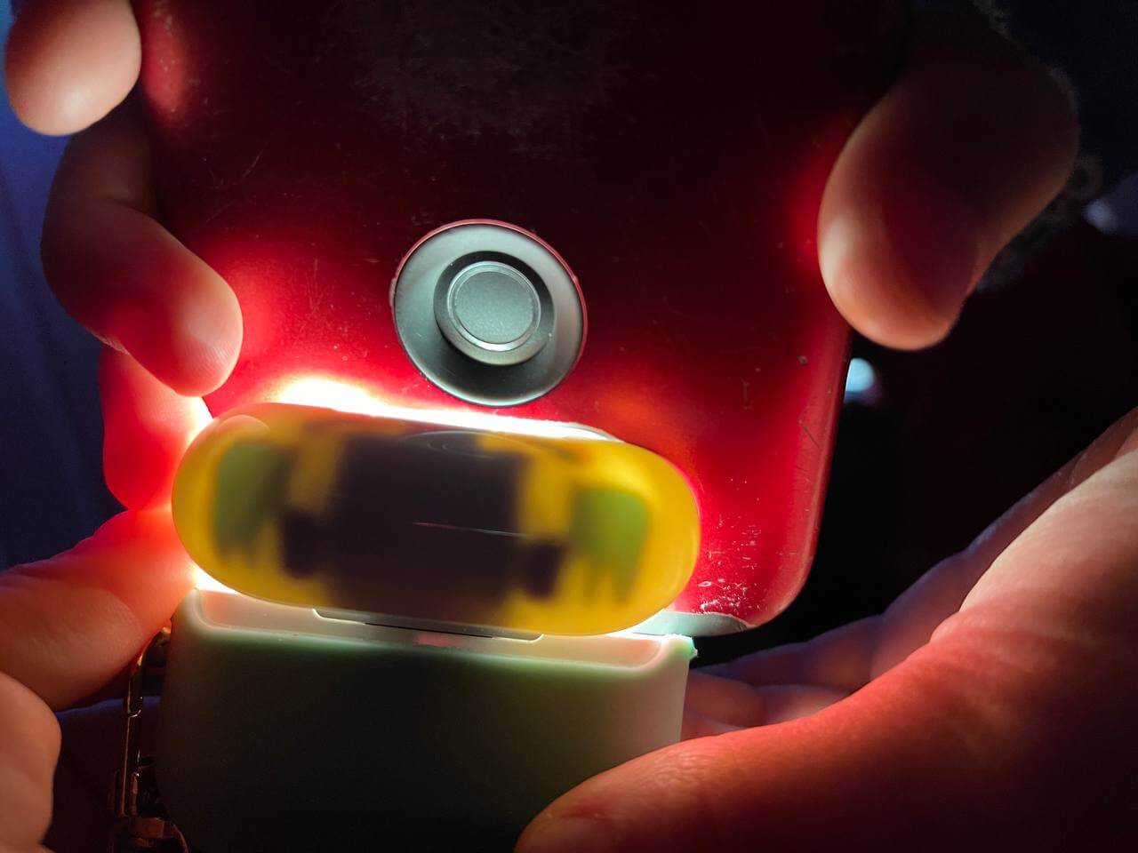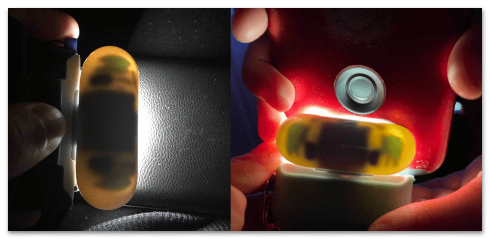 Ещё один приём, который можно задействовать, рассказали читатели в нашем чате в Telegram. Приложите телефон с включенным фонариком вплотную к крышке зарядного кейса, предварительно открыв её. Оригинальная крышка на просвет будет выглядеть так: