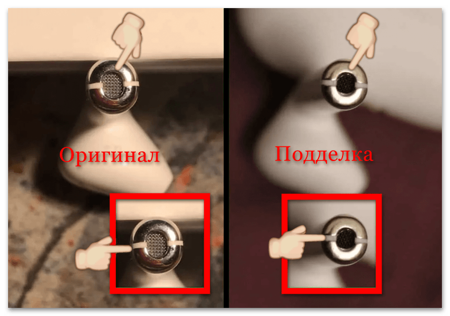 В нижней пластмассовой части наушников есть отверстие. У оригиналов оно чёрного цвета, а у реплик серого.