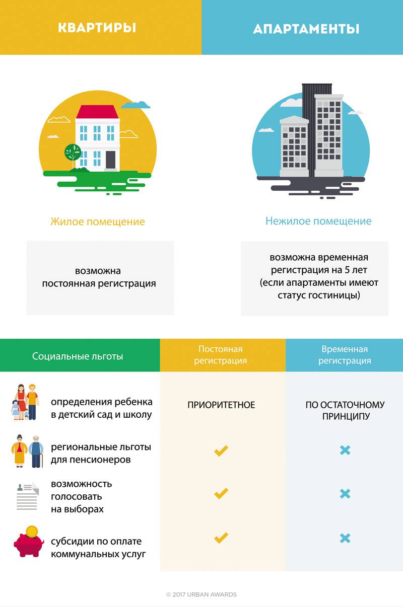 По закону нежилая недвижимость не может использоваться в качестве места проживания физического лица. А значит, хотя апартаменты и представляют собой жилье, зарегистрировать здесь место жительства не получится. В отношении квартиры таких запретов нет, и жильцы могут здесь регистрироваться без ограничений.