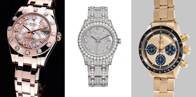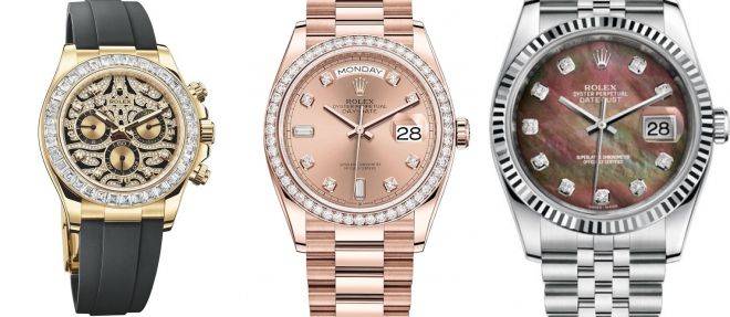 Самые дорогие часы Rolex «Пол Ньюман», названые в честь первого владельца актера и автогонщика, были выставлены на аукцион и проданы почти за 18 000 000$. Это было в 2017 году и пока этот рекорд не побит. Специальные аукционные лоты начинают свою стоимость с 5 000 000$. Самые дорогие часы на официальных сайтах продаются от 65 000€ до 190 000€. Они выполняются из золота или платины и украшаются россыпью драгоценных камней. Камни могут присутствовать по ободку корпуса, на циферблате или браслете и быть разного цвета, размера, формы.