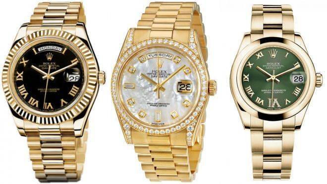 - Day-Date. Цена на золотые часы с ремешком из кожи питона можно приобрести от 16 000$, а изделия с бриллиантами достигают в цене до 120 000$.