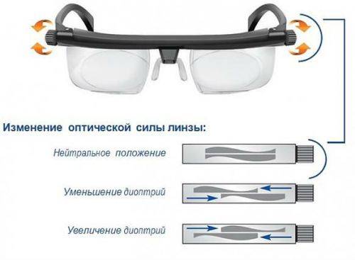 Конструкция регулируемых очков позволяет, как у бинокля, настраивать оптическую силу линз для каждого глаза