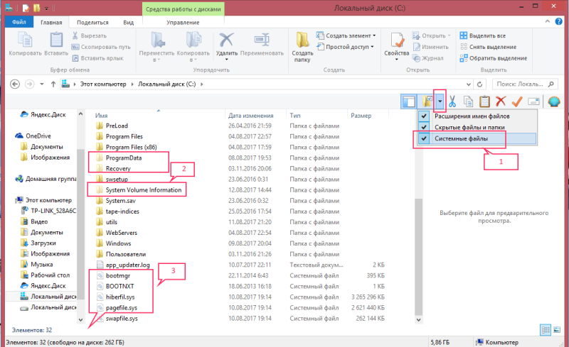 На рисунке цифрой 2 отмечены системные (скрытые) папки, цифрой 3 – файлы. Рисунки иконок скрытых файлов и папок – полупрозрачные. При повреждении этих файлов – операционная система может перестать работать, поэтому их делают скрытыми.