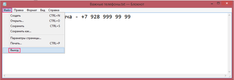 Что бы корректно закрыть программу «Блокнот» после завершения редактирования документа необходимо в левом верхнем углу окна нажать левую кнопку мышки на пункте меню «Файл»
