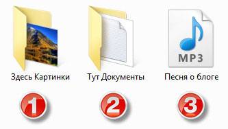 На изображении выше вы можете увидеть папку с картинками (1), папку с документами (2) и музыкальный файл (3), который не находится в папке.