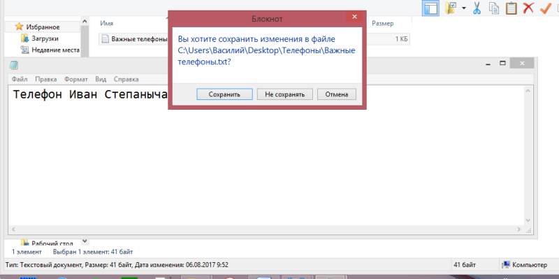 – далее идет имя файла и путь, где он сохраняется. Если нажать «Сохранить», «Блокнот» – закрывается, данные сохраняются в наш файл. Если выбрать пункт «Не сохранить» – программа закрывается, изменения не записываются. При выборе пункта «Отмена» – продолжается редактирование документа.
