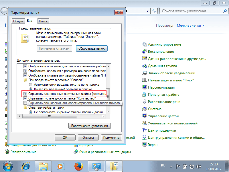 Важные файлы, необходимые для работы операционной системы, скрыты от обычного пользователя. Эти файлы называются системными. Мы сможем увидеть эти файлы, если в меню параметры папок ОС Windows 7 снимем галочку «Скрывать защищенные системные файлы»