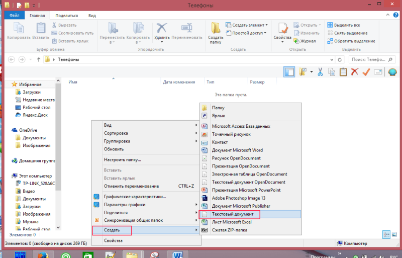 Давайте создадим файл – текстовый документ. Щелкаем на свободном месте папки (в данном случае оно у нас все свободно) левой кнопкой мышки, в меню выбираем «Создать», в следующем — «Текстовый документ».