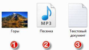Интуитивно понятный вид позволяет различать типы файлов. Выше вы могли заметить изображение (1), музыкальный файл (2) и текстовый документ (3).