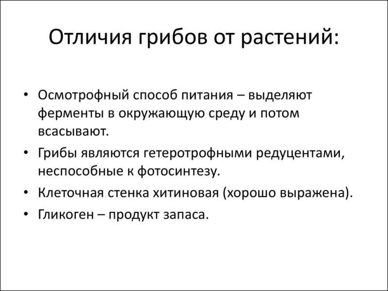 Грибы также имеют нечто общее с царством растений. Их объединяет то, как они поглощают питательные вещества. Способ происходит путем поглощения из субстрата через клеточную стенку. У высших представителей царства это происходит посредством особого органа — мицелия. Но у них нет хлорофилла, а значит, реакция фотосинтеза невозможна.