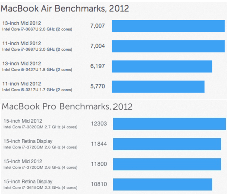 Тесты производительности для моделей MacBook Pro и MacBook Air 2012 года, представленные в Primate Labs, следующие (чем выше цифры, тем лучше):