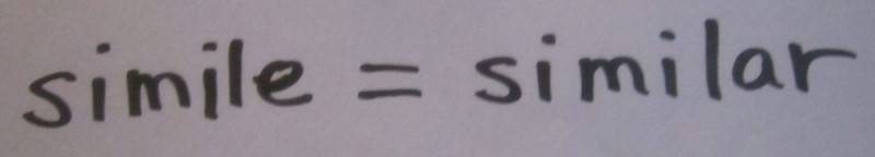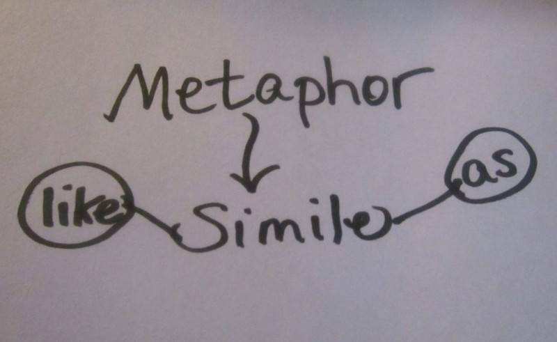 Я всегда помнил, что сравнение похоже. Аналогично. Похоже. Аналогичный. Видите ли, похожие по звучанию слова. Итак, похожие предметы сравниваются словами «как» или «как». Метафора также сравнивает две вещи с другой, но слова «как» или «как» опускаются. Сравнение говорит, что один предмет похож на другой; метафора говорит, что один предмет – это другой. Это простейшее объяснение этих двух литературных терминов.