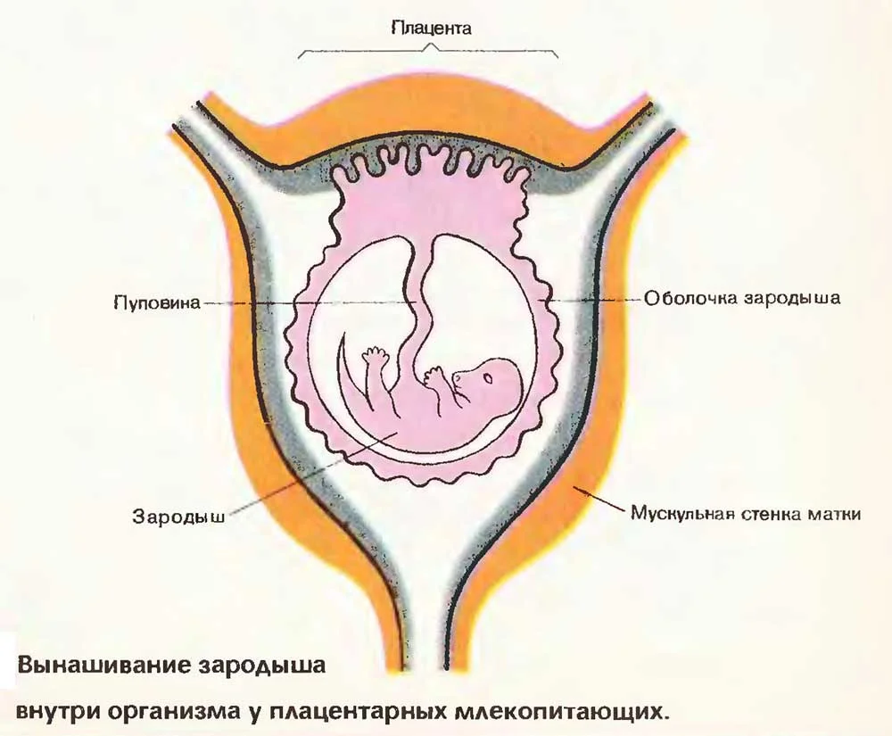 Размножение плацентарных млекопитающих отличается развитием плода внутри материнского организма. Развитие млекопитающих начинается с оплодотворенной яйцеклетки, которая прикрепляется к стенке матки. Вокруг зародыша образуются оболочки, прирастающие к этой стенке. Это место называется плацентой, или детским местом. Через нее происходит передача питательного материала от матери к зародышу.