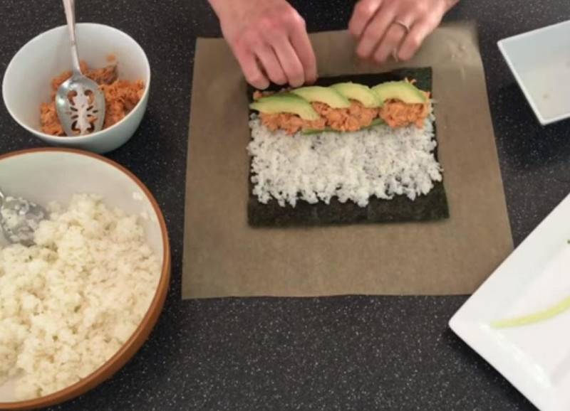 Далее на рис следует выложить все необходимые ингредиенты (кроме рыбы), а потом завернуть рис, как обычно. Во время заворачивания роллов пищевую пленку следует отогнуть и придать блюду необходимую форму.