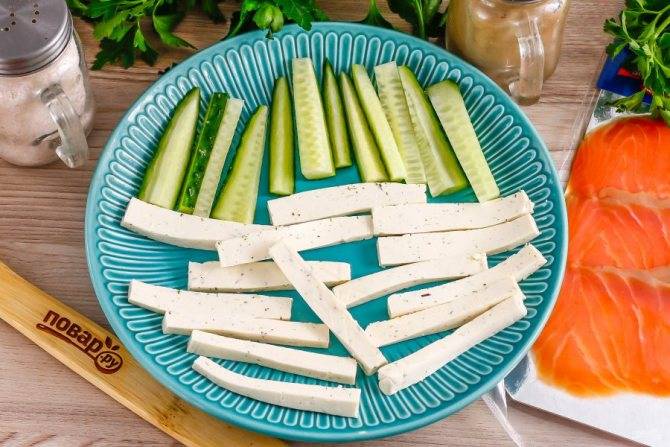 Промойте огурец в воде, срежьте хвостики. Нарежьте овощ и сыр продольными брусочками.