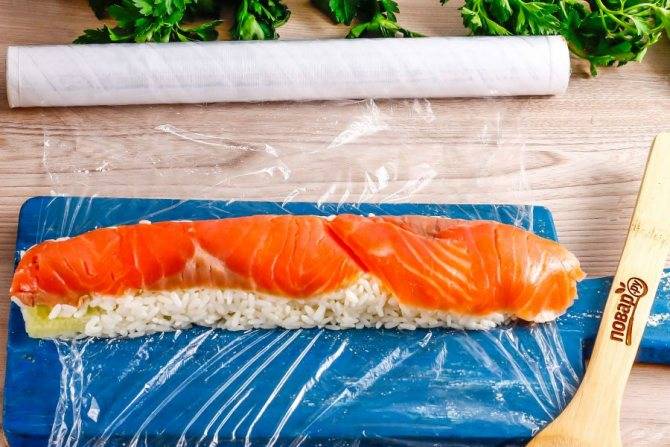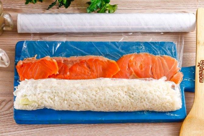 С помощью пленки аккуратно сверните рис, чтобы начинка оказалась внутри него. Далее на пленку выложите нарезку слабосоленой семги. Рулет из риса «прокатите» дальше до рыбы и слегка прижмите, чтобы рыбная нарезка оказалась сверху.