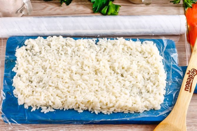 Застелите досочку пищевой пленкой и выложите на нее отварной рис, стараясь это сделать как можно ровнее.