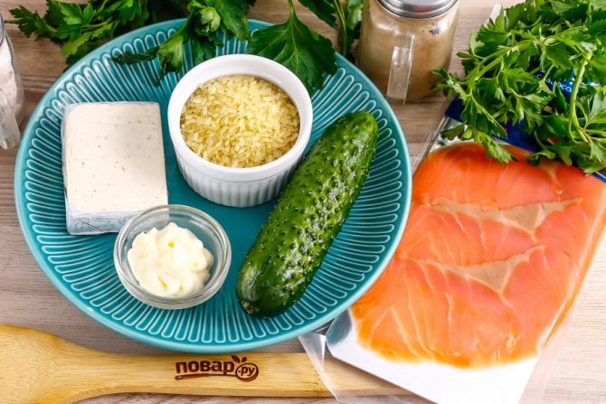 Подготовьте указанные ингредиенты. Плавленый сыр и майонез вы можете заменить сливочным сыром, а свежий огурец — авокадо.
