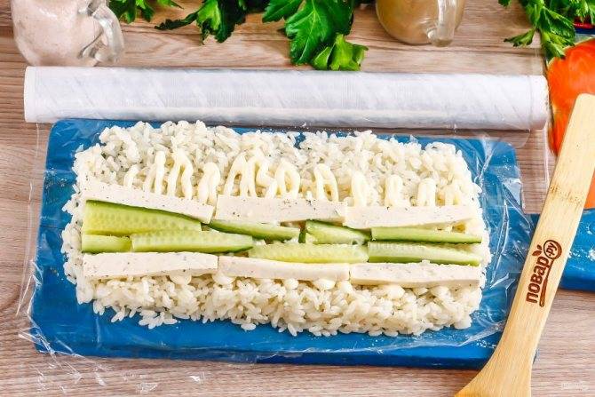Выложите сеточку из майонеза, если используете плавленый сыр. Выложите нарезки плавленого сыра и огурца на один край рисового слоя.