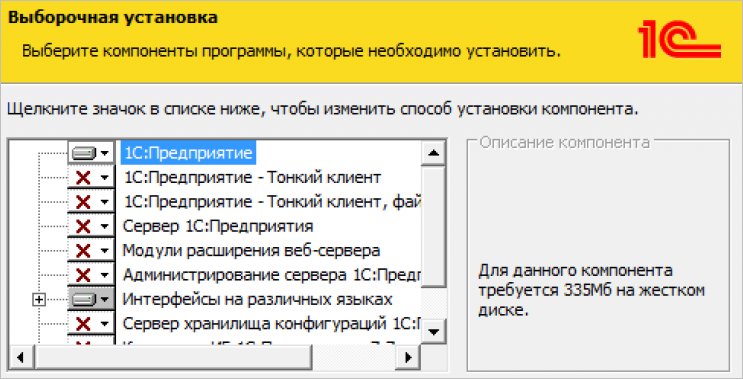 Установка выполняется из одного дистрибутива с возможностью выбора различных компонентов. Можно установить тонкий клиент, толстый, сервер, а также все вместе одновременно.