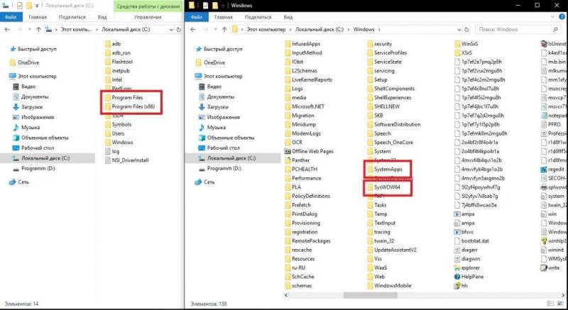 Достаточно посмотреть на корневой каталог системы, в котором можно найти папки System32 и SysWOW64. В первой как раз и находятся компоненты, отвечающие за корректный запуск 32-битных программ в среде 64-битных ОС, а второй предназначен только для 64-битных приложений, но является своего рода дублирующим, поскольку в нем можно найти точно такие же апплеты и библиотеки, которые есть в директории System32. То же самое относится и к каталогам, в которые программное обеспечение устанавливается. В 64-битных ОС для этого имеется две папки Program Files, но одна из них имеет обозначение «х86», что и свидетельствует о ее предназначении для хранения файлов 32-битных приложений.