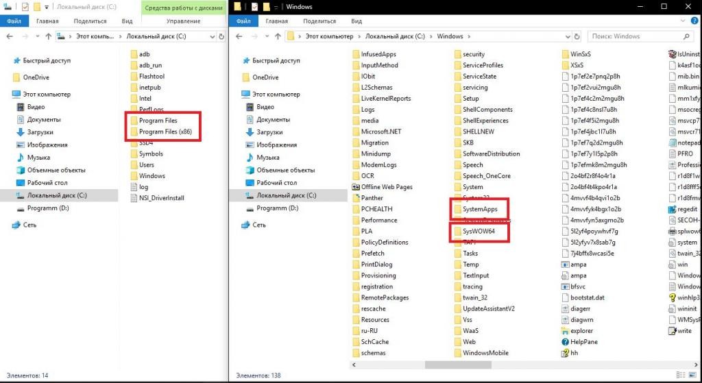 Достаточно посмотреть на корневой каталог системы, в котором можно найти папки System32 и SysWOW64. В первой как раз и находятся компоненты, отвечающие за корректный запуск 32-битных программ в среде 64-битных ОС, а второй предназначен только для 64-битных приложений, но является своего рода дублирующим, поскольку в нем можно найти точно такие же апплеты и библиотеки, которые есть в директории System32. То же самое относится и к каталогам, в которые программное обеспечение устанавливается. В 64-битных ОС для этого имеется две папки Program Files, но одна из них имеет обозначение «х86», что и свидетельствует о ее предназначении для хранения файлов 32-битных приложений.