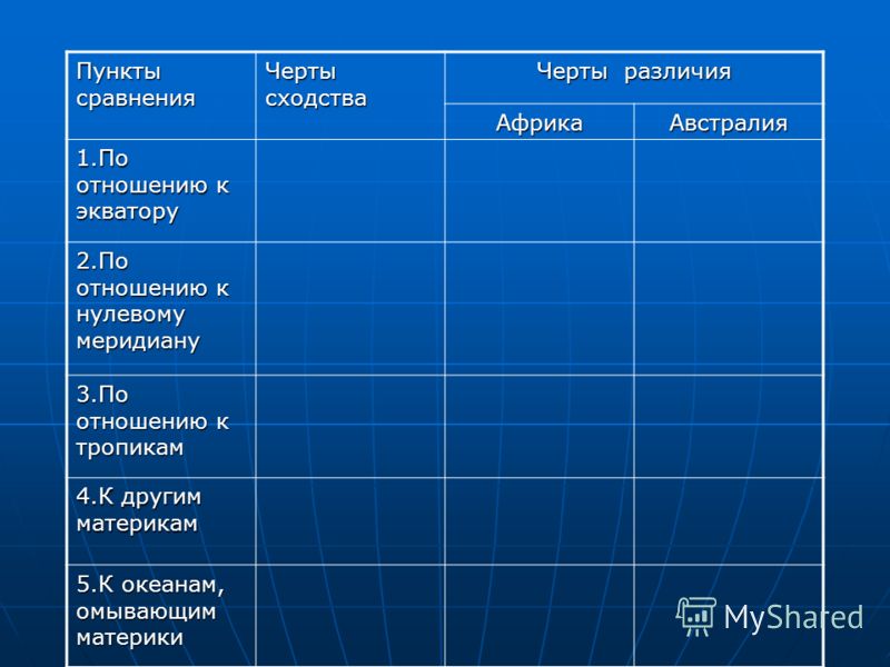 Пункты сравнения Черты сходства Черты различия АфрикаАвстралия 1.По отношению к экватору 2.По отношению к нулевому меридиану 3.По отношению к тропикам 4.К другим материкам 5.К океанам, омывающим материки