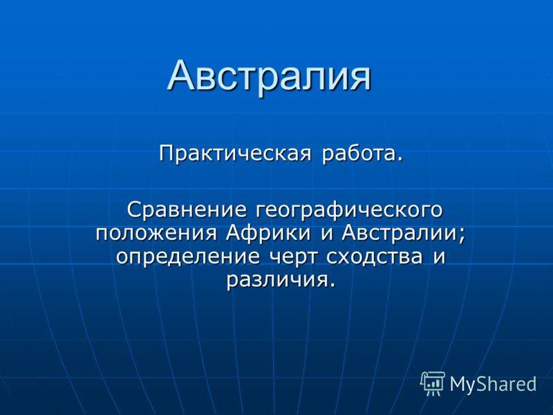 Австралия Практическая работа. Сравнение географического положения Африки и Австралии; определение черт сходства и различия. Сравнение географического положения Африки и Австралии; определение черт сходства и различия.