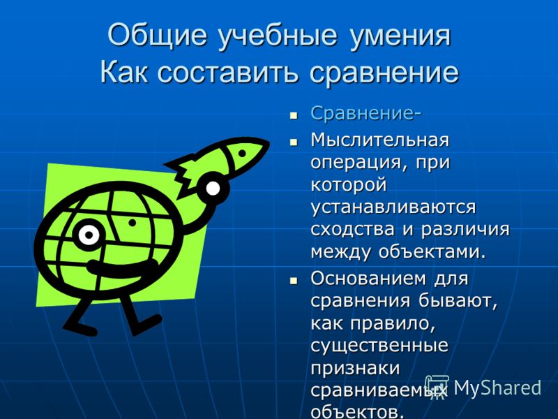Общие учебные умения Как составить сравнение Сравнение- Сравнение- Мыслительная операция, при которой устанавливаются сходства и различия между объектами. Мыслительная операция, при которой устанавливаются сходства и различия между объектами. Основанием для сравнения бывают, как правило, существенные признаки сравниваемых объектов. Основанием для сравнения бывают, как правило, существенные признаки сравниваемых объектов.