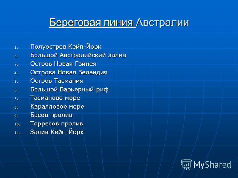 Береговая линия Береговая линия Австралии Береговая линия 1. Полуостров Кейп-Йорк 2. Большой Австралийский залив 3. Остров Новая Гвинея 4. Острова Новая Зеландия 5. Остров Тасмания 6. Большой Барьерный риф 7. Тасманово море 8. Каралловое море 9. Басов пролив 10. Торресов пролив 11. Залив Кейп-Йорк