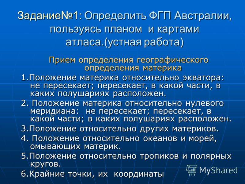 Задание1: Определить ФГП Австралии, пользуясь планом и картами атласа.(устная работа) Прием определения географического определения материка 1.Положение материка относительно экватора: не пересекает; пересекает, в какой части, в каких полушариях расположен. 2. Положение материка относительно нулевого меридиана: не пересекает; пересекает, в какой части; в каких полушариях расположен. 3.Положение относительно других материков. 4. Положение относительно океанов и морей, омывающих материк. 5.Положение относительно тропиков и полярных кругов. 6.Крайние точки, их координаты