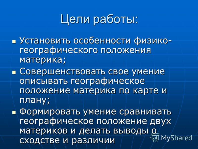 Цели работы: Установить особенности физико- географического положения материка; Совершенствовать свое умение описывать географическое положение материка по карте и плану; Формировать умение сравнивать географическое положение двух материков и делать выводы о сходстве и различии