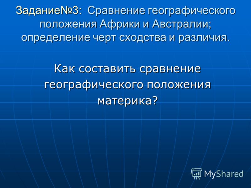 Задание3: Сравнение географического положения Африки и Австралии; определение черт сходства и различия. Как составить сравнение Как составить сравнение географического положения географического положения материка? материка?