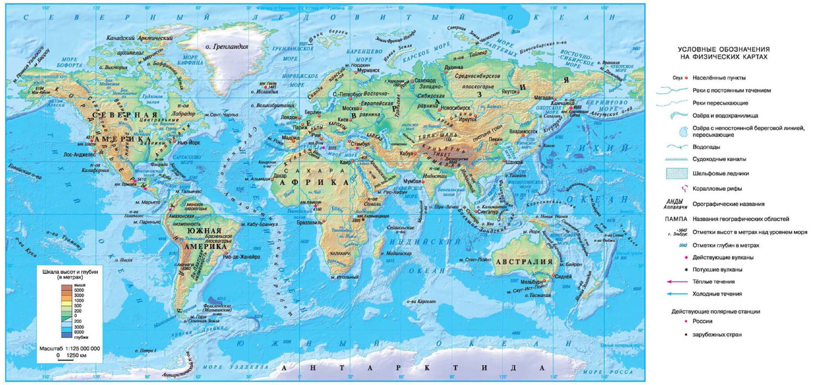 В-третьих, видно, что на каждом материке есть и горы, и равнины (под ледяным куполом Антарктиды тоже). Посмотрев на карту строения земной коры можно убедиться, что действительно в основе каждого материка находится древняя платформа (а в Евразии даже не одна). Платформам в рельефе соответствуют в основном равнины. Горы формировались вокруг ядер платформ последовательно в разные эпохи складчатости. Вспомнив древние материки Лавразию и Гондвану, можно легко представить, что «кольцо» нынешних пор окружает осколки единых в прошлом платформ древних материков.