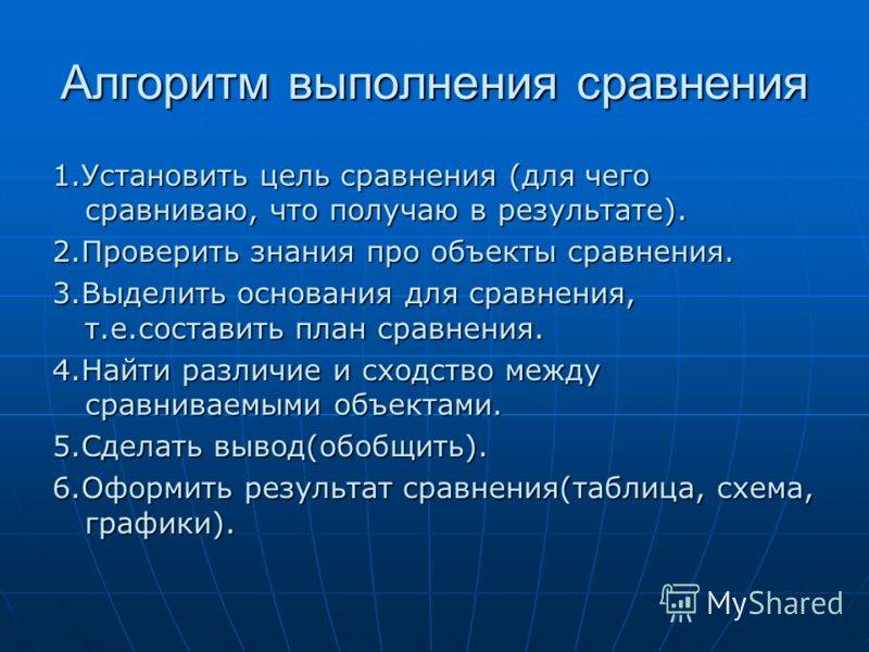 Алгоритм выполнения сравнения 1.Установить цель сравнения (для чего сравниваю, что получаю в результате). 2.Проверить знания про объекты сравнения. 3.Выделить основания для сравнения, т.е.составить план сравнения. 4.Найти различие и сходство между сравниваемыми объектами. 5.Сделать вывод(обобщить). 6.Оформить результат сравнения(таблица, схема, графики).