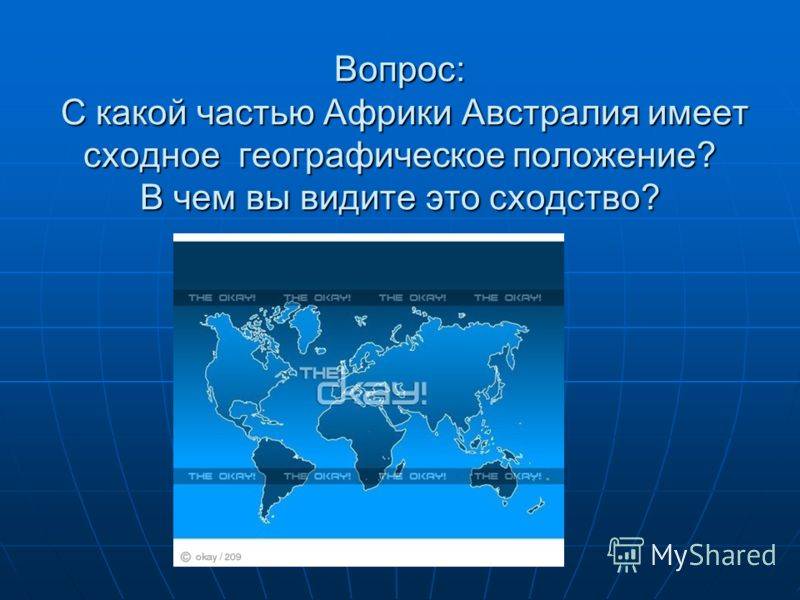 Вопрос: С какой частью Африки Австралия имеет сходное географическое положение? В чем вы видите это сходство?